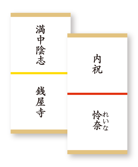 名書きは、寺院進物品であれば「寺院名様」及びお誕生内祝であれば「お子様の芳名」等がございます。ご不明な点はご相談ください。