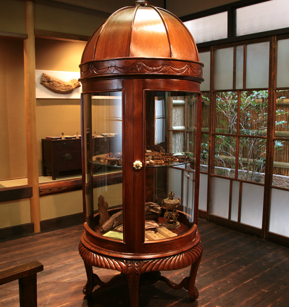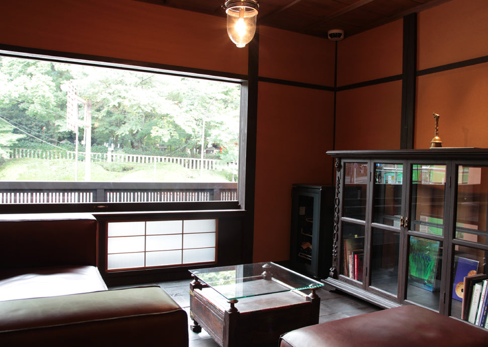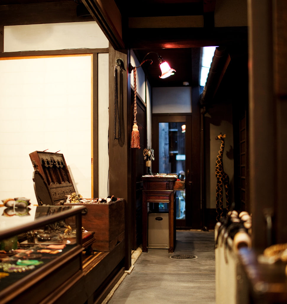 職人が作業する座敷の前に設置されたベンチ。ここに座って、ゆったり作業を眺めたり、職人との会話を楽しむ事ができます。また、店内奥には世界各国から集められた調度品がディスプレイされており、仕上がりを待つ間も目を楽しませてくれます。
