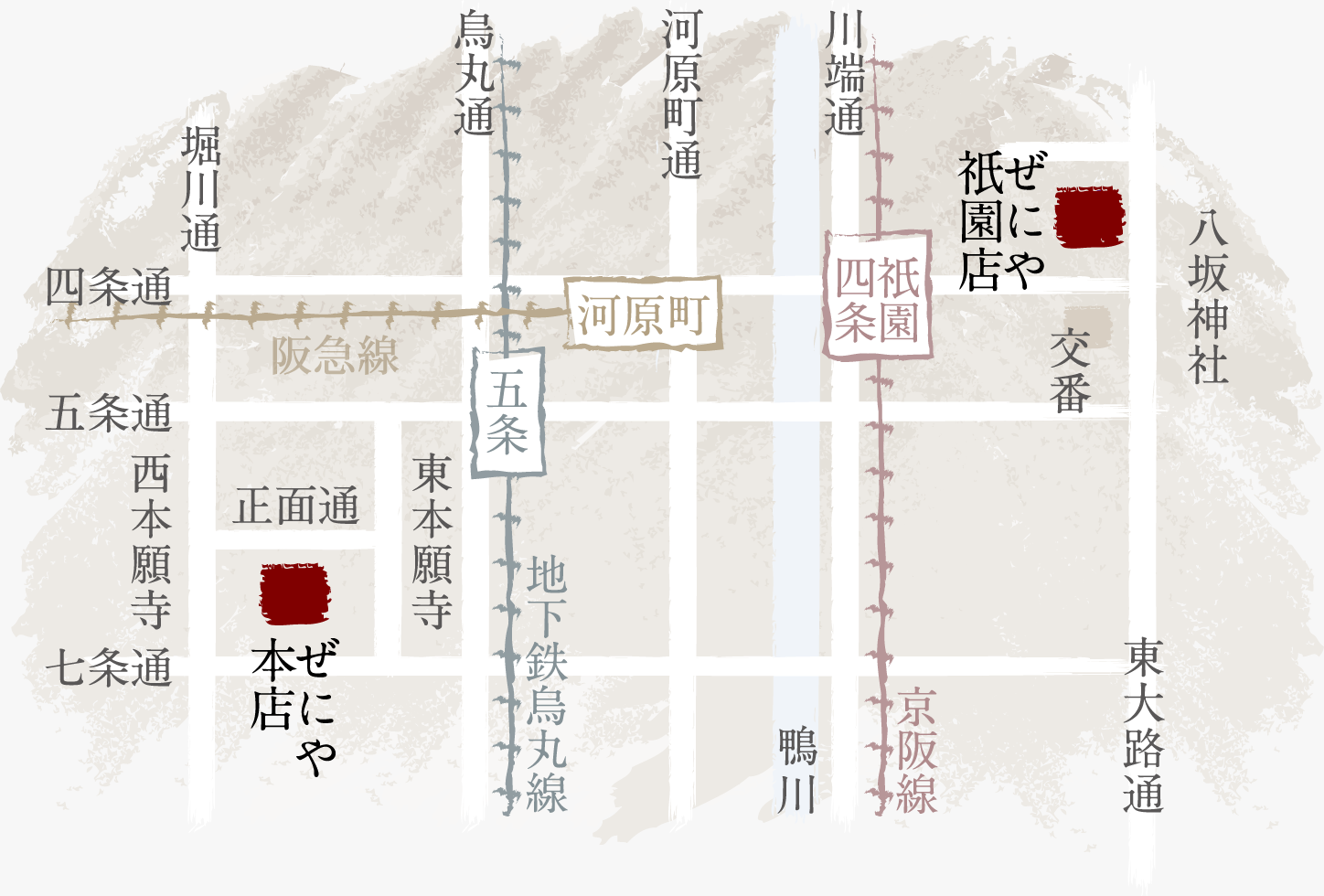 四条通りを東に進むと、正面に八坂神社。突き当たって東大路を北へ進むと、ほんの少し歩いたところにぜにや祇園店がございます。ぜにや祇園店では、かつて職人とお客様が自由にやり取りをしていた京町家の特色を活かし、職人とお客様の距離が近い空間を作り上げました。歴史の風合いを感じさせながら、モダンにリメイクされた店内をごゆっくりお楽しみください。