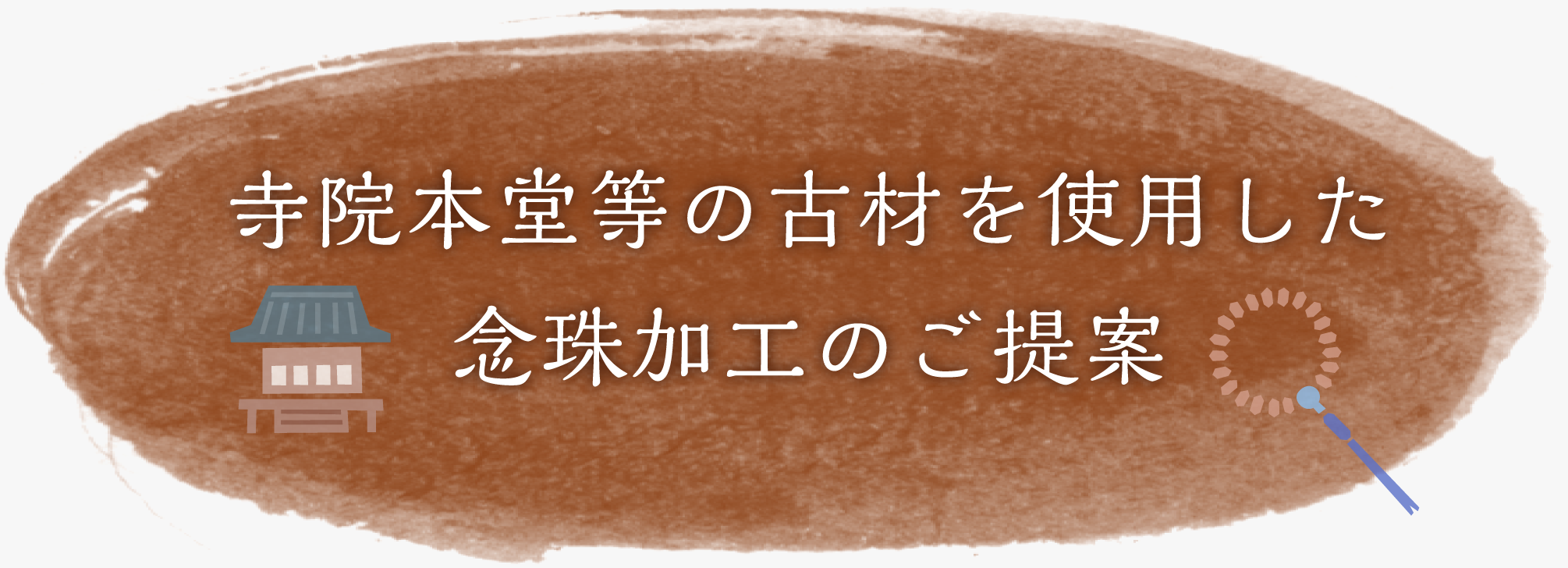 近年、寺院本堂等の新築・改築の際有縁ある材を使用した念珠等へ加工するお問い合わせが増えております。ぜにやでは、有縁ある材を使用したオリジナル念珠を記念品としてお手伝いさせて頂きます。