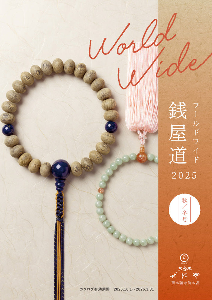 今回は素材や珠の形状にこだわったぜにや限定オリジナル念珠が盛り沢山です。“銭屋”にちなんだちょっと変わった珠形状の念珠や、ご進物におすすめできる和布のセット商品も登場いたします。