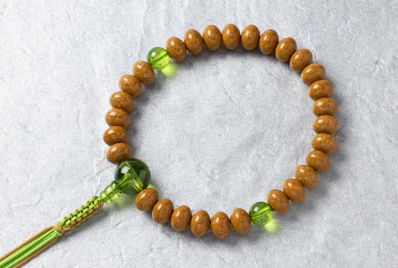 天竺菩提樹10×13.5ミリ単念珠ダークグリーンアンバー仕立
