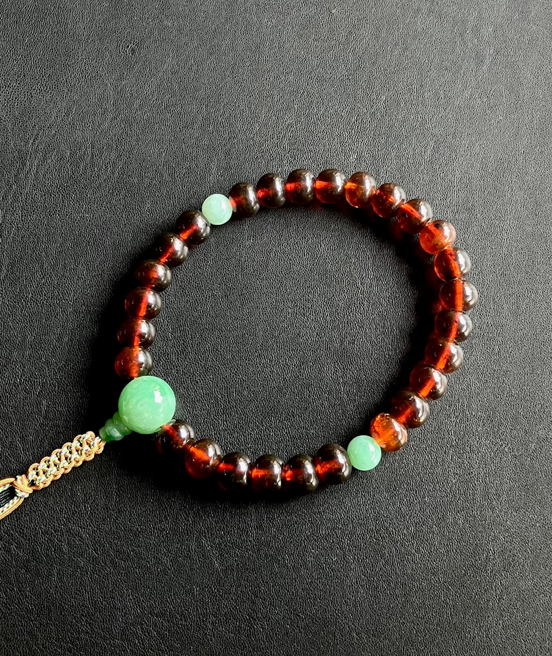 撫順琥珀10x12ミリみかん玉単念珠緑翡翠仕立