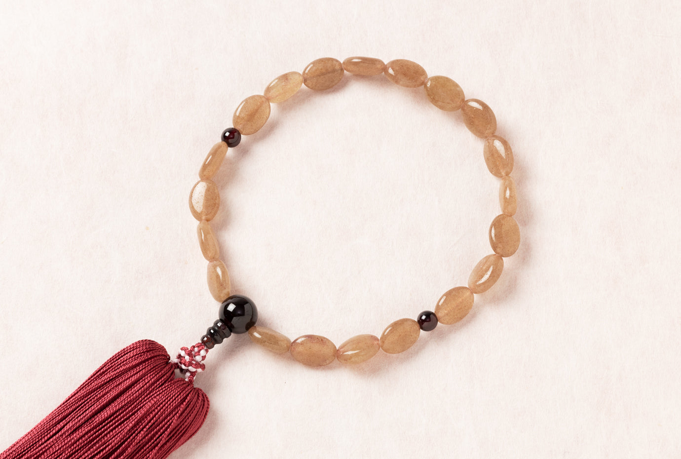 人気の変わり珠念珠。ストロベリークオーツのオーバル型です。落ち着いたピンクにガーネットの深紅が映えるこだわり念珠。
