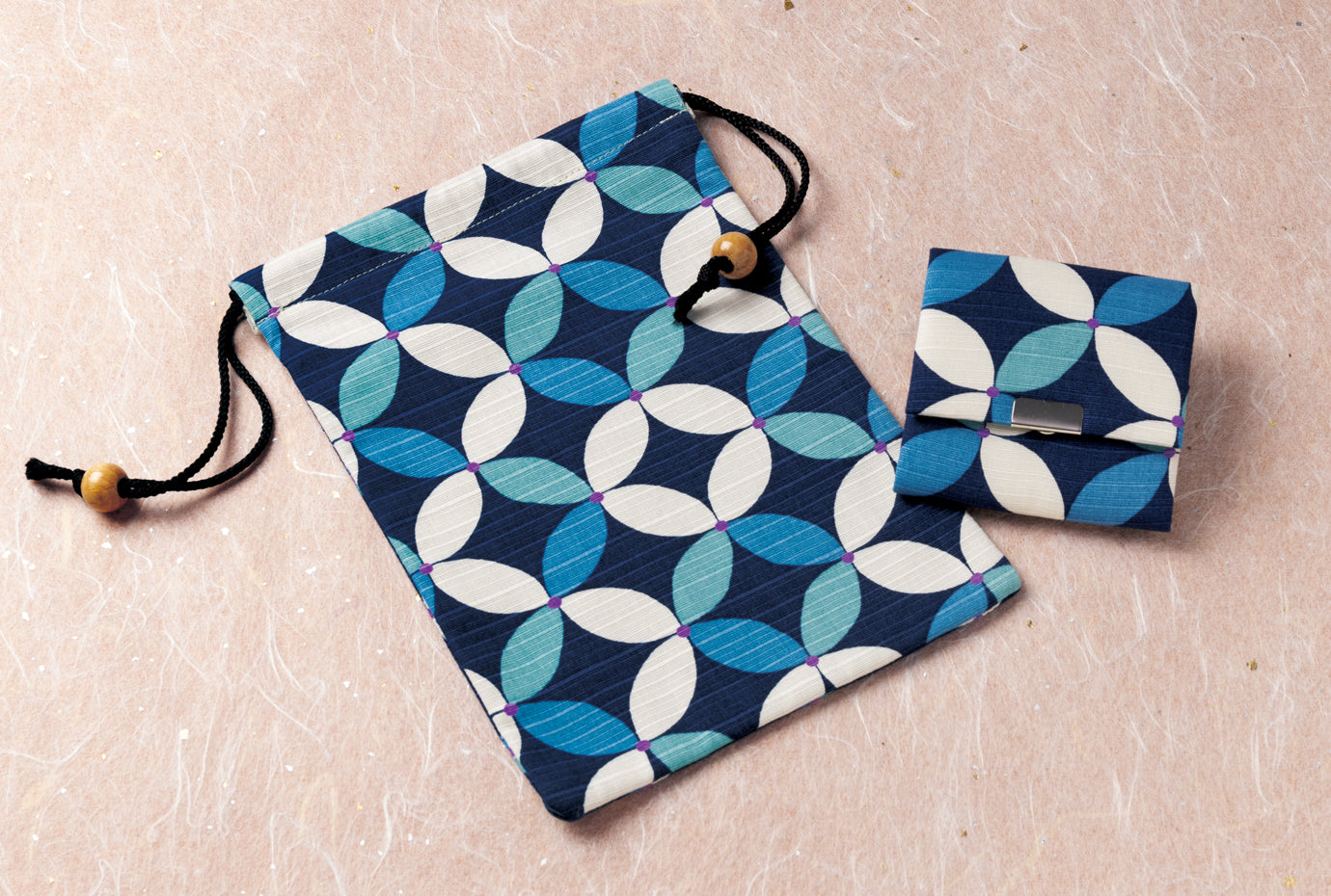日本の伝統的な小紋柄『七宝』をカラフルにアレンジして、巾着袋とボックス型小銭入をセットにしました。